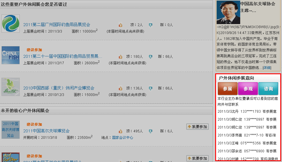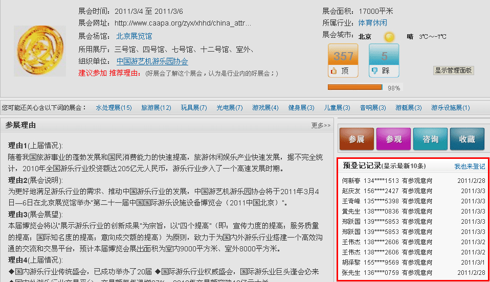 觀眾和展商在瀏覽你的展會時,可以點擊“我要參觀”、“我要參展”、“我要咨詢”,他們的信息將在頁面上有所顯示:
