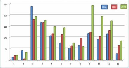 3. 展覽數(shù)量在趨于平均,比如春季的3個(gè)月和秋季的3個(gè)月,而比較一下三年前的展會(huì)(見下一張圖),近兩年來,這個(gè)現(xiàn)象是不明顯的,而以前,3月和9月有明顯的數(shù)量優(yōu)勢(shì)。