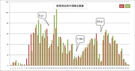 好展會(huì)從自身數(shù)據(jù)庫中檢索了2009年、2010年的展會(huì)情況,把開展日期按周分組,得到了本圖。
