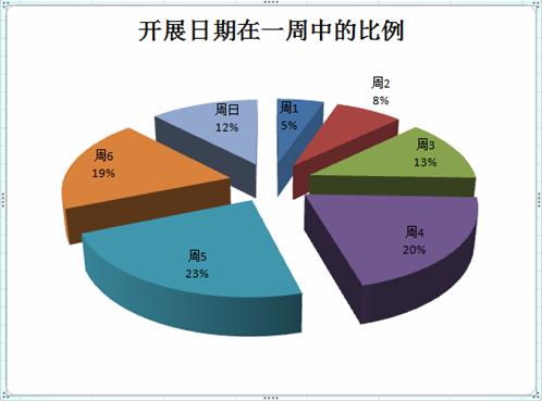 從統(tǒng)計(jì)的角度,我們?nèi)?010年的會(huì)做樣本,看看一周的哪天是大家最選擇的開展日期: