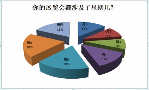 本報(bào)告還對(duì)每個(gè)展會(huì)涉及一周的哪幾天進(jìn)行了統(tǒng)計(jì)(統(tǒng)計(jì)工作量很大,但邏輯很簡單,就是對(duì)每個(gè)展覽會(huì),每天算一遍,看屬于哪一天),下表是統(tǒng)計(jì)的數(shù)據(jù),您可以看到:20%的展會(huì)都會(huì)有周六的一天,而作為對(duì)比,涉及了周二、周三的比例只有9%。