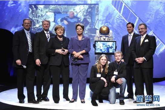 3月5日,在德國(guó)漢諾威,德國(guó)總理默克爾(左三)和巴西總統(tǒng)羅塞夫(左四)等在博覽會(huì)開(kāi)幕式上參加與國(guó)際空間站宇航員現(xiàn)場(chǎng)連線的活動(dòng)。當(dāng)晚,世界上規(guī)模最大的IT展會(huì)之一——漢諾威信息及通信技術(shù)博覽會(huì)舉行開(kāi)幕式,本屆博覽會(huì)將從3月6日持續(xù)到3月10日,伙伴國(guó)是巴西。