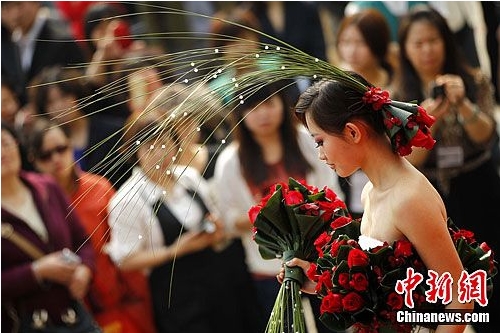 4月9日,一場由鮮花制成的婚紗秀亮相北京萊太花卉市場。
