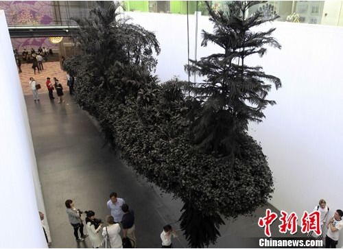 4月15日,北京觀眾在觀看尤倫斯當代藝術中心的新展《空中墨花園》。藝術家馬文用黑色的墨汁和鮮活的植物創(chuàng)作出這座“空中花園”。在展覽的展出過程中,作品中的植物會繼續(xù)生長,綠色的枝葉會穿透黑色。馬文想?yún)⒄瞻捅葌惪罩谢▓@的傳奇,利用此次展覽來展現(xiàn)自然的力量,同時她也在用這種方式探索著中國最“傳統(tǒng)”的媒介在當代藝術中的可能性。(來源:中新網(wǎng))