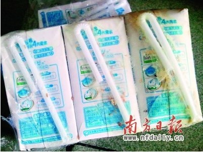 4月19日晚,家住東莞長安錦廈新村的謝先生經(jīng)不住兒子的央求,在附近的百佳超市買了一箱生產(chǎn)日期標(biāo)明為“20120302”的蒙牛兒童牛奶回家??蓴?shù)日后他才發(fā)現(xiàn),箱內(nèi)部分未拆包裝的牛奶外殼上長滿蟲子,這讓全家人對(duì)已喝了幾盒這箱牛奶的兒子的健康擔(dān)心不已。