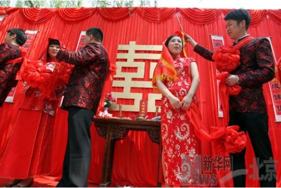 5月8日,一場(chǎng)按照北京民俗舉辦的中式集體婚禮在北海公園舉行,六對(duì)新人喜結(jié)良緣。此次婚禮揭開了2012西城時(shí)尚婚慶文化博覽會(huì)的“蓋頭”。作為2012北京西單國際時(shí)尚節(jié)系列主題活動(dòng)之一,2012北京西城時(shí)尚婚慶文化博覽會(huì)于5月8日--13日在北海公園舉辦。(來源:新華網(wǎng))
