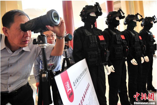 5月9日,“第八屆中國(guó)國(guó)際國(guó)防電子展覽會(huì)”在北京展覽館開(kāi)幕,來(lái)自美國(guó)、瑞士、德國(guó)等12個(gè)國(guó)家和地區(qū)的三百多家海外知名品牌企業(yè)參展,數(shù)十家世界駐華使館的武官前來(lái)觀展。圖為軍警專用的國(guó)產(chǎn)數(shù)字化單兵作戰(zhàn)系統(tǒng)及夜間攝像儀吸引觀眾。(來(lái)源:中新網(wǎng))