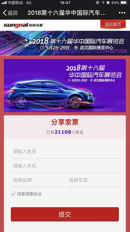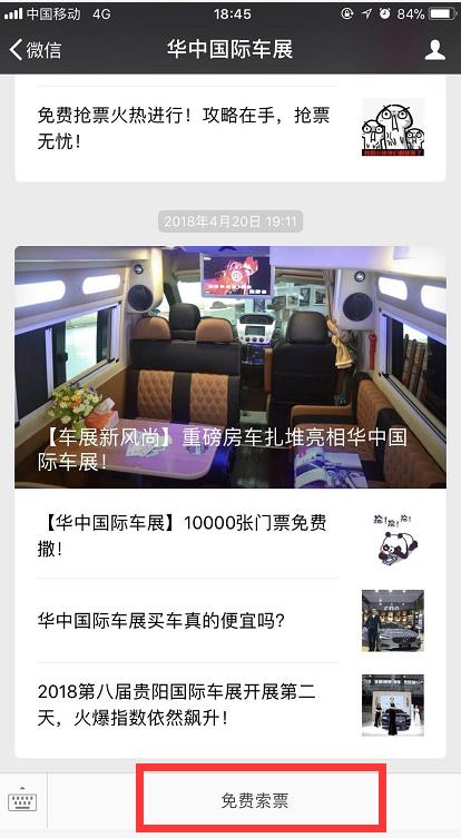 第一步:進(jìn)入“華中國際車展”官方微信,點(diǎn)擊菜單欄“免費(fèi)索票”