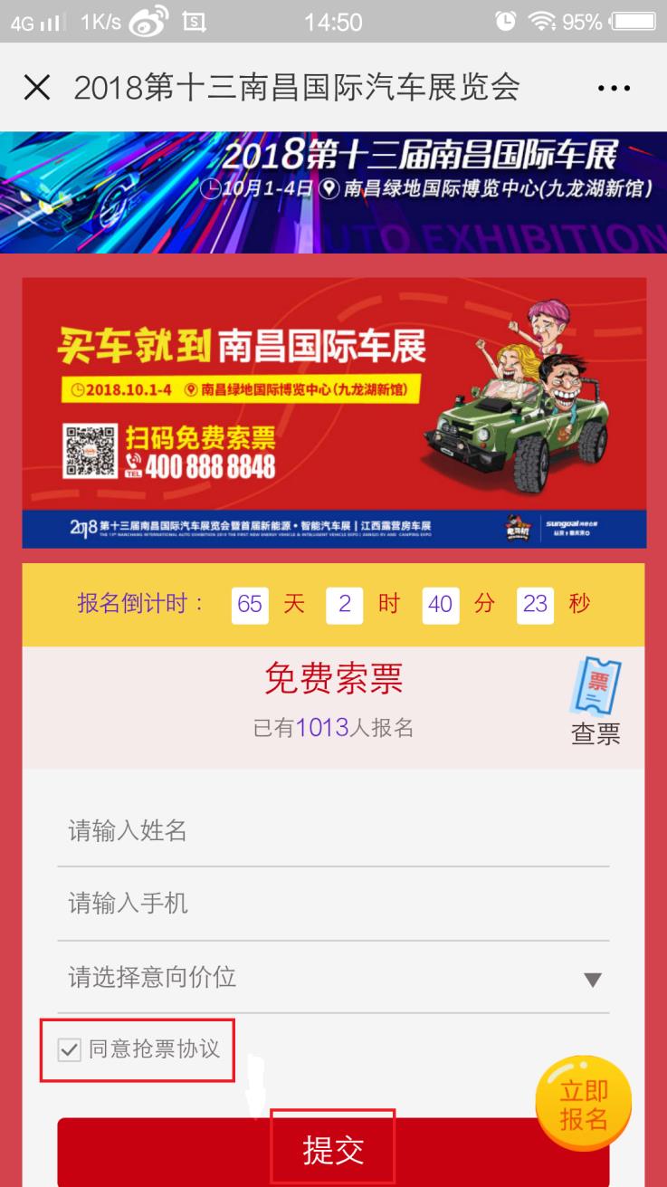 關(guān)注“南昌國(guó)際車展”微信號(hào),點(diǎn)擊下方【免費(fèi)搶票】進(jìn)入頁(yè)面提交信息即可。