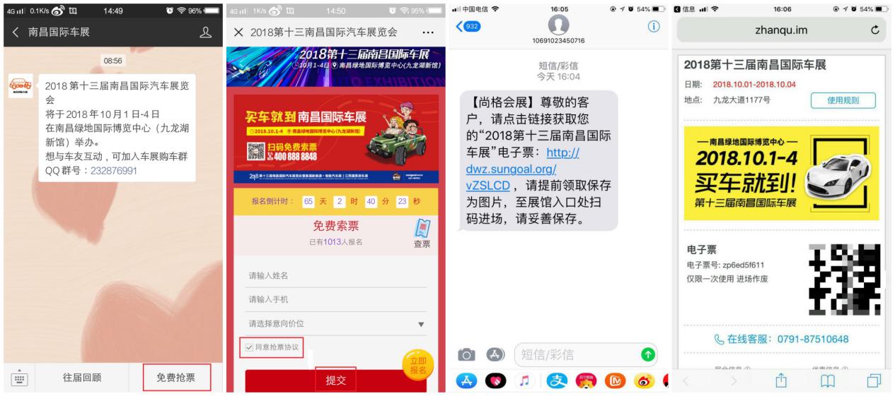 關(guān)注“南昌國(guó)際車展”微信號(hào),點(diǎn)擊下方【免費(fèi)搶票】進(jìn)入頁面提交信息即可。官方客服電話回訪核對(duì)信息后,電子門票直接發(fā)送到您的手機(jī)上,點(diǎn)開鏈接查看電子票;入場(chǎng)前可以進(jìn)入官方微信【南昌國(guó)際車展】點(diǎn)擊菜單【票證查詢】進(jìn)入查詢頁面即可打開電子票圖片;