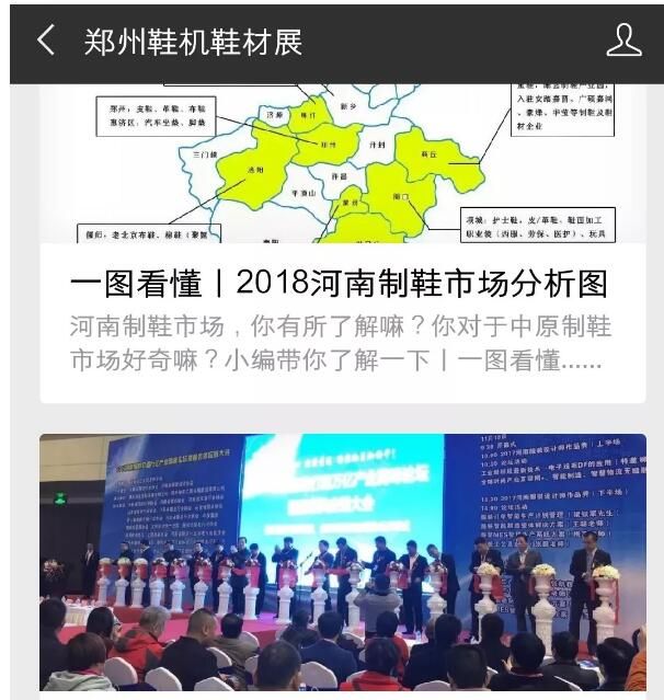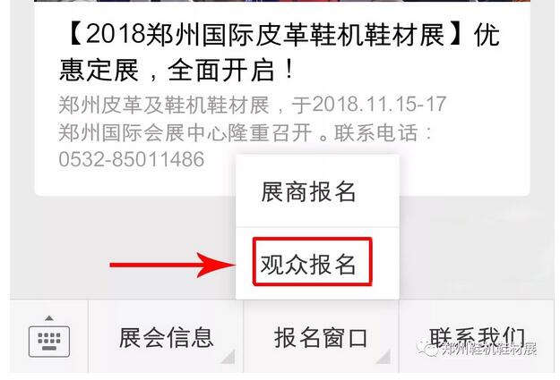 方式二:關(guān)注官方微信公眾號(hào)【鄭州鞋機(jī)鞋材展】,點(diǎn)擊微信公眾號(hào)底部菜單進(jìn)行預(yù)登記。