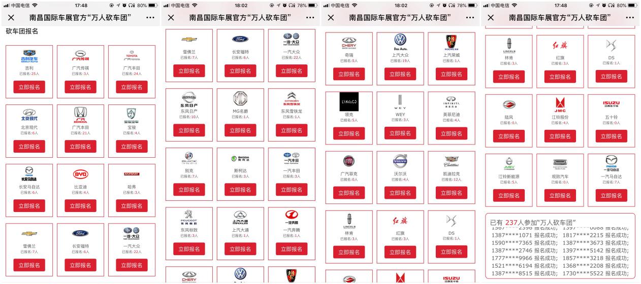 1、即日起至9月30日,通過(guò)微信關(guān)注“南昌國(guó)際車展”,點(diǎn)擊【萬(wàn)人砍車團(tuán)】按鈕進(jìn)入專題,選擇喜歡的汽車品牌即可免費(fèi)報(bào)名參加“南昌國(guó)際車展官方萬(wàn)人砍車團(tuán)”活動(dòng)(每人限報(bào)一個(gè)砍車團(tuán));