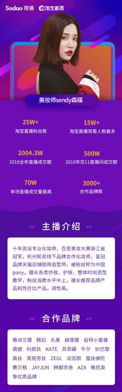 提及搜道,這是一家第一批入駐淘寶直播的機構,自直播上線來,穩(wěn)居淘寶直播top機構席位,旗下簽約主播達50余名,合作達人百余位,其中打造培養(yǎng)出首席百萬級粉絲柔柔家柔柔、30W+粉絲、20W+粉絲主播近二十位,主播類目已涵蓋美妝、母嬰、美食、運動健身等不同范疇。 2018年旗下主播帶動銷售超百萬筆,總銷售額突破一億大關;整體數(shù)據(jù)名列五百家淘寶直播機構前十。