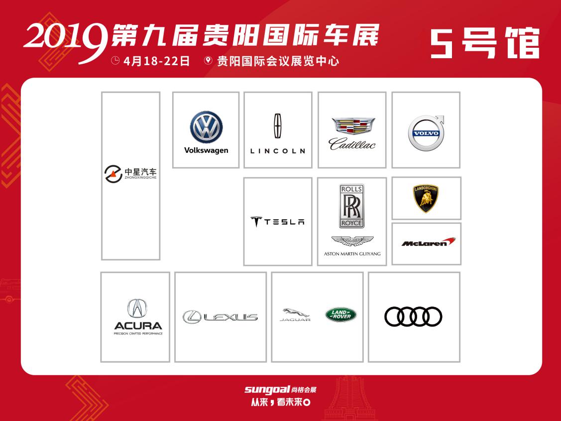 5號(hào)館(按順時(shí)針方向):中星汽車、進(jìn)口大眾、林肯、凱迪拉克、沃爾沃、蘭博基尼、邁凱倫、勞斯萊斯、阿斯頓馬丁、特斯拉、奧迪、路虎、捷豹、雷克薩斯、謳歌