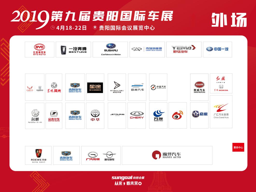 外 場(chǎng)(按順時(shí)針方向):比亞迪汽車、一汽奔騰、斯巴魯、奇瑞新能源、野馬汽車、中國(guó)一汽、紅旗、斯威汽車、中星汽車、歐尚汽車、新特汽車、星途、吉利汽車、東風(fēng)風(fēng)光、寶沃汽車、五菱汽車、MG、眾泰汽車、中華、捷途、奇瑞汽車、萬友、新浪、東風(fēng)啟辰、廣匯汽車服務(wù)、瀚羿汽車、海馬汽車、廣汽傳祺、吉利汽車、榮威汽車