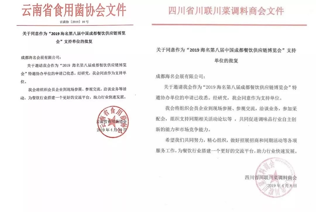 【朱臺(tái)鎮(zhèn)行業(yè)商會(huì)、全國(guó)工商聯(lián)廚具商會(huì)西部工作站、成都市水產(chǎn)行業(yè)協(xié)會(huì)、云南省食用菌協(xié)會(huì)、四川省川聯(lián)川菜調(diào)料商會(huì) 復(fù)函】