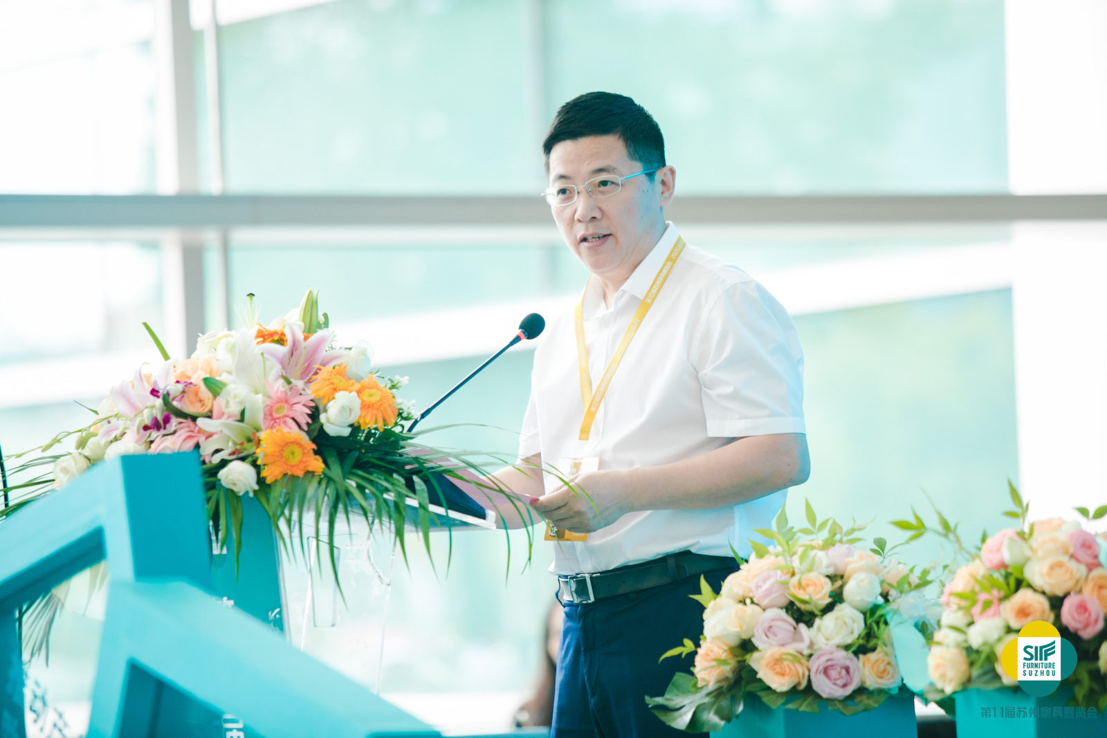 中國(guó)家具協(xié)會(huì)副理事長(zhǎng)、江蘇家具品牌聯(lián)盟主席、斯可馨家具股份有限公司董事長(zhǎng)胡衛(wèi)東先生上臺(tái)致辭。胡衛(wèi)東先生表示,蘇州家具展的穩(wěn)定發(fā)展,推動(dòng)了江蘇家具品牌聯(lián)盟、華東家具在國(guó)內(nèi)的行業(yè)影響力,作為參展品牌,要想長(zhǎng)久立足于長(zhǎng)三角這個(gè)行業(yè)聚集地,除了自身的發(fā)展機(jī)遇,更要借助像蘇州家具展這樣的行業(yè)平臺(tái)來給企業(yè)帶來更多資源、更多助力。目前在互聯(lián)網(wǎng)大趨勢(shì)下,行業(yè)轉(zhuǎn)型升級(jí)大背景下,家具企業(yè)必須聯(lián)合起來,以蘇州家具展為契機(jī),集中展現(xiàn)江蘇家具品牌的整體形象,集中提升江蘇家具品牌的整體市場(chǎng)競(jìng)爭(zhēng)力,在激烈的市場(chǎng)角逐中贏得更廣闊的的發(fā)展空間!