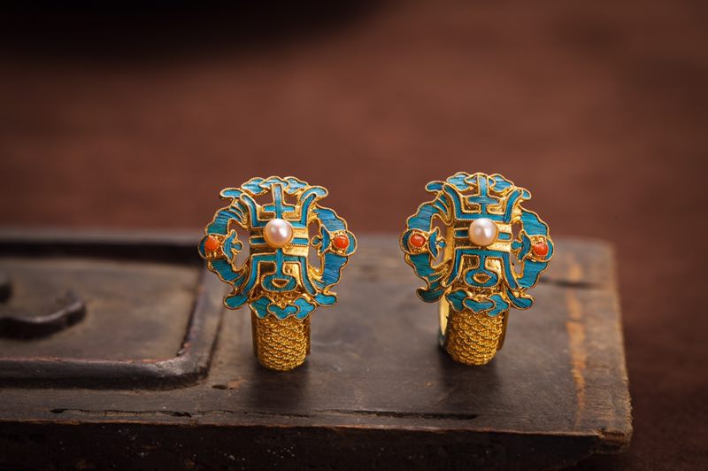 耳環(huán)引用傳統(tǒng)蝙蝠、團壽、祥云等吉祥圖案,藍色部分采用點翠工藝,點綴珍珠等有機寶石,圈體為手工花絲,整體工藝細膩,搭配完美堪稱完美之作。