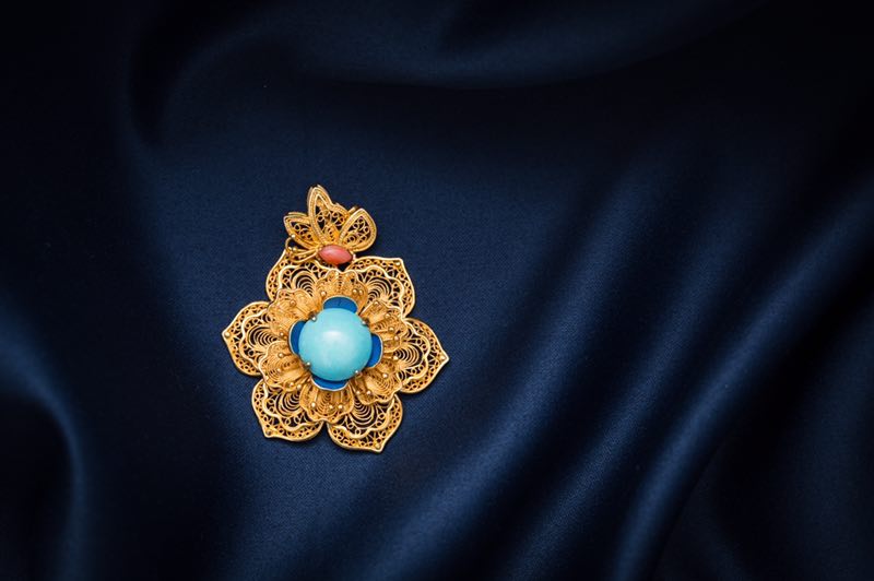 蝴蝶和花面均為手工花絲之作,點綴天然松石和有機寶石等,整體造型優(yōu)雅美麗,細膩繁復,富有古韻的時尚作品。