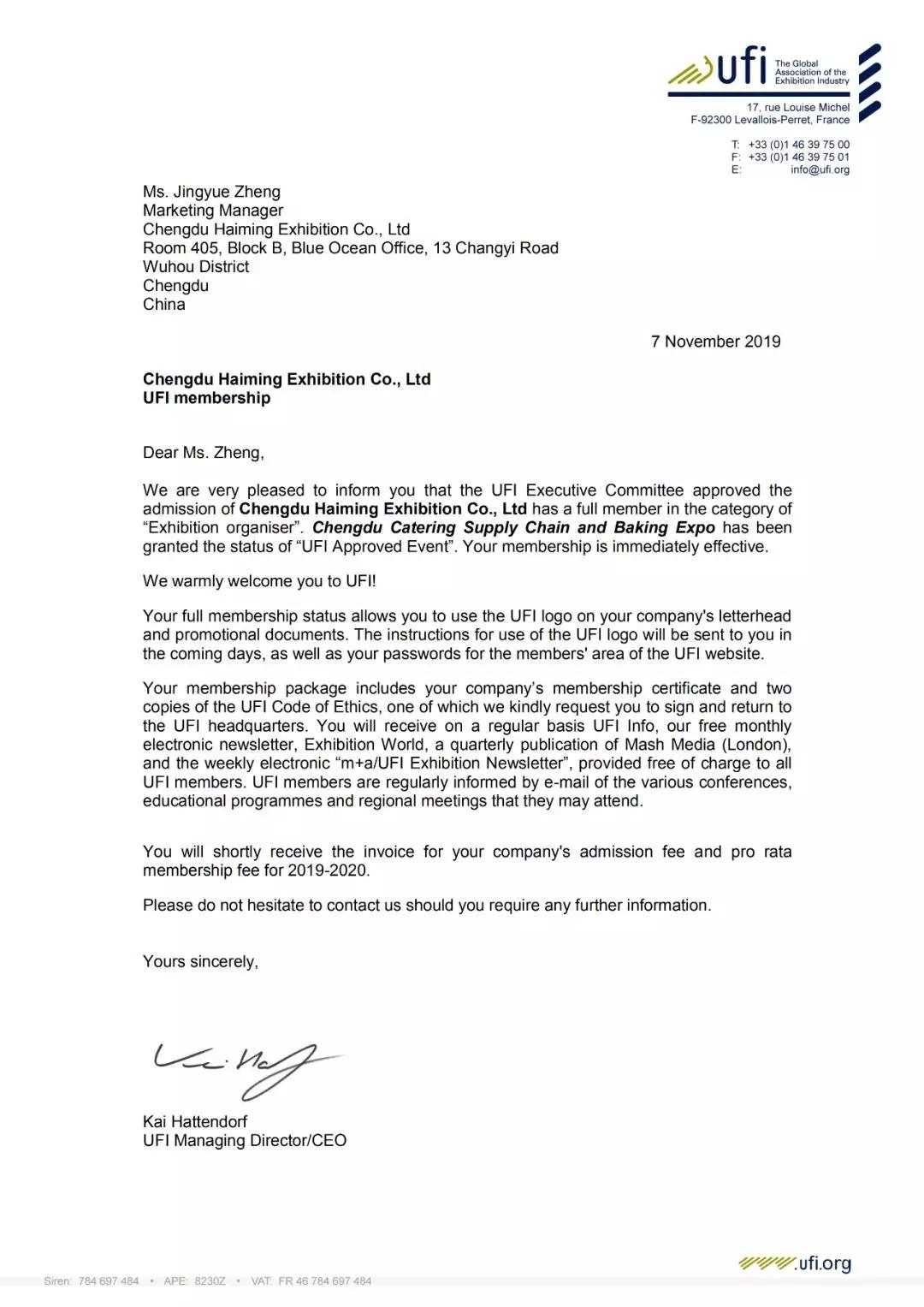 2019年11月7日,UFI(國際展覽業(yè)協(xié)會)巴黎總部傳來喜訊:海名成都餐飲供應鏈及烘焙博覽會正式通過UFI認證,展會主辦方成都海名會展有限公司通過UFI評審委員會的表決,正式成為UFI會員單位。