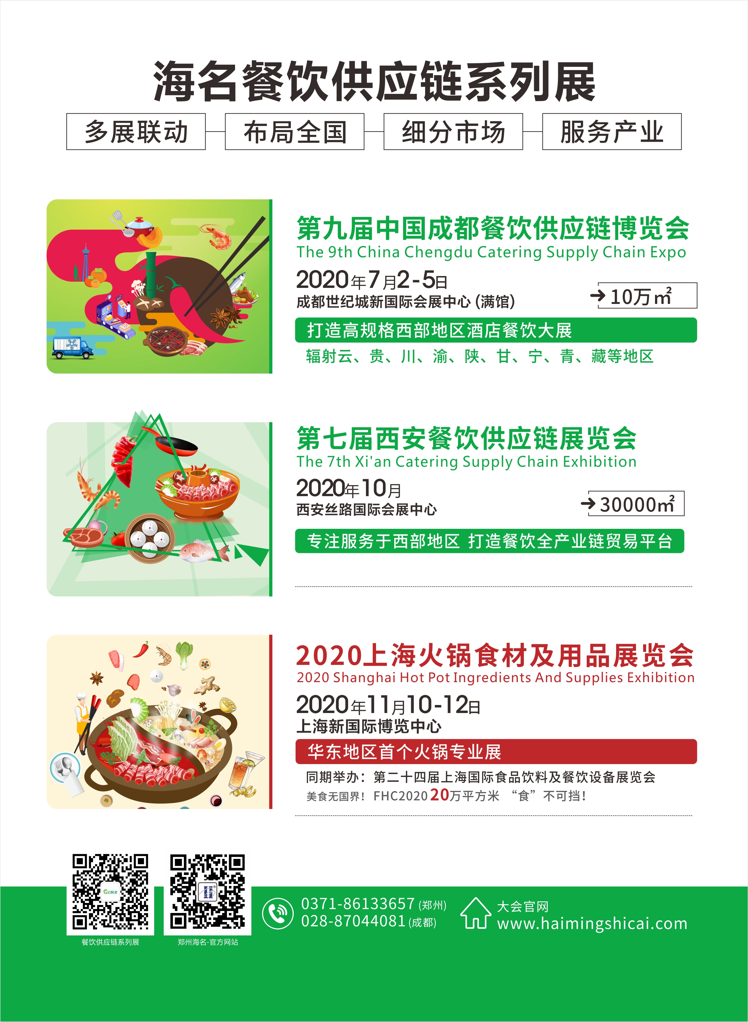 海名餐飲供應鏈系列展已累計成功舉辦成都、西安等地區(qū)共計18屆,2020年海名第九屆成都餐飲供應鏈及烘焙博覽會攜手博華第七屆Hotelex國際酒店用品及餐飲博覽會于2020年7月2-5日成都世紀城新國際會展中心舉辦;展出面積達到成都世紀城會展中心全館10萬平方米。2020年海名成都餐飲展匯聚來自全國及世界包括餐飲食材、火鍋食材、調(diào)味品、烘焙與包裝、咖啡茶飲、食品綜合、烘焙冰淇淋,以及涵蓋酒店用品、綜合餐飲設備、餐飲加工與包裝、火鍋設備及用品、餐飲供應鏈服務、餐飲連鎖加盟等多版塊超過2000家一線餐飲產(chǎn)業(yè)鏈品牌企業(yè)參展。10萬平米餐飲酒店業(yè)大展的超大規(guī)模虹吸效應,將聯(lián)動全國50余家餐飲行業(yè)協(xié)會及媒體,搭建集行業(yè)交流、產(chǎn)業(yè)對接、品牌打造于一體的供需貿(mào)易展會平臺,預計將吸引來自中西部地區(qū)——川、渝、云、貴、陜、甘、寧、青、藏等省市、自治區(qū)超過10萬酒店餐飲產(chǎn)業(yè)鏈專業(yè)觀眾匯聚蓉城。