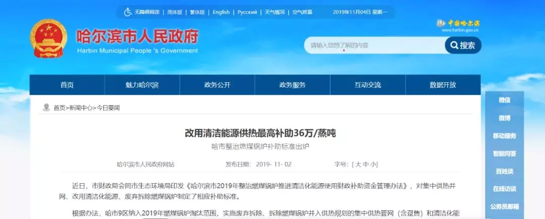 去年哈爾濱市財政局會同哈爾濱市生態(tài)環(huán)境局印發(fā)《哈爾濱市2019年整治燃煤鍋爐推進清潔化能源使用財政補助資金管理辦法》,對集中供熱并網(wǎng)、改用清潔化能源、廢棄拆除燃煤鍋爐制定了相應(yīng)補助標(biāo)準(zhǔn)。