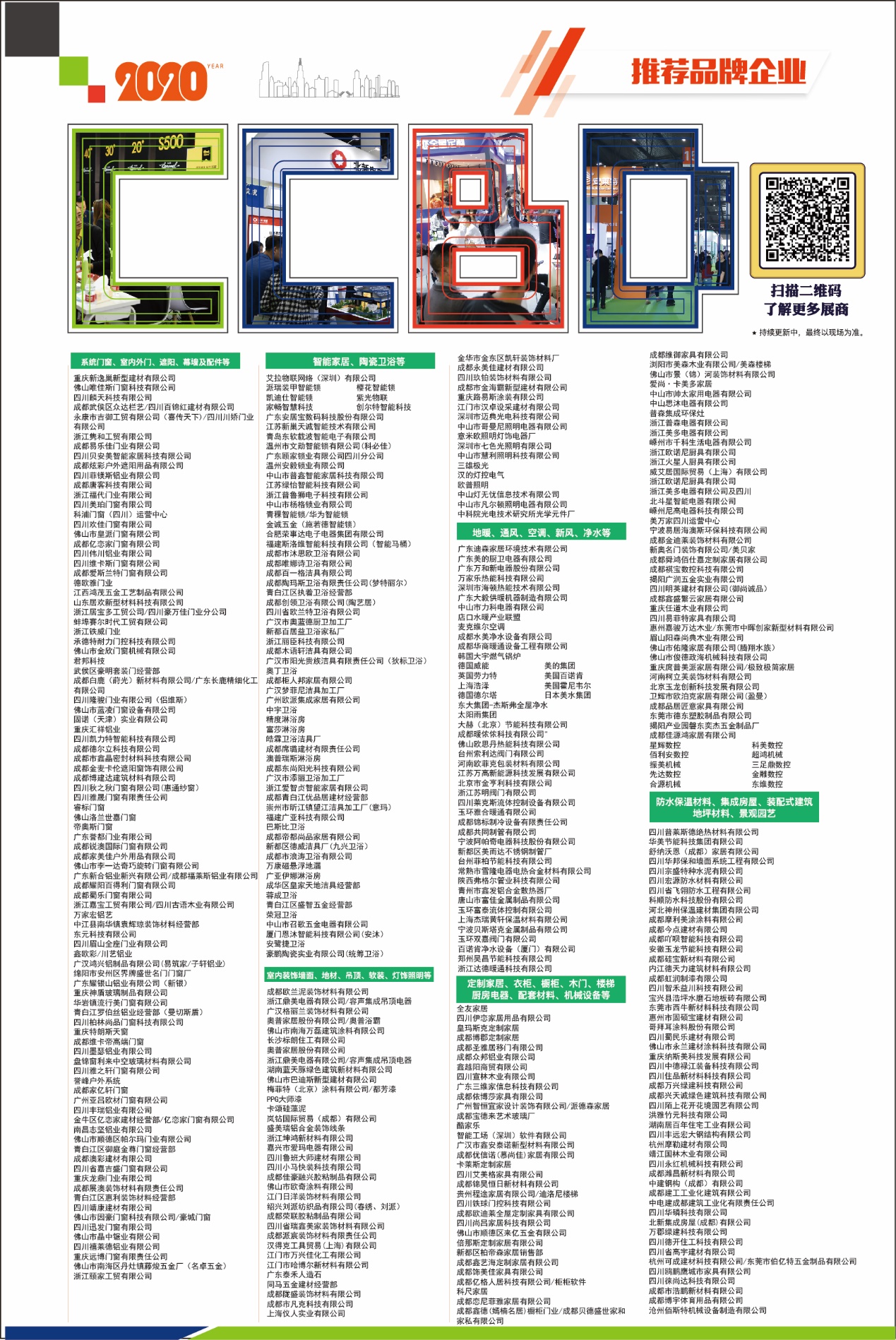 作為國內(nèi)大家居建裝行業(yè)領先展會,2020成都建博會秉承全產(chǎn)業(yè)鏈展出的聚合優(yōu)勢,不斷完善“大家居、智能舒適家居、節(jié)能建筑新材料“三大主題展,展館劃分細致,展品種類全面,經(jīng)過前期不斷努力,招展已經(jīng)進入收尾工作,截止目前參展企業(yè)超1400家。展館分布為:1、2、3號門窗館,3-4連接館陶瓷展區(qū),4號智能家居/衛(wèi)浴館,5號墻面/吊頂/地材/軟裝館,5-6連接館燈飾照明展區(qū),9號活動論壇館,10號暖通凈水館,10-11連接館廚電展區(qū),11、14號定制家居館,14-15連接館定制設備展區(qū),15號建筑新材料館,16號裝配式建筑/園林館,展會由“建”到“裝”由配套材料到成品涵蓋全產(chǎn)業(yè)鏈產(chǎn)品展示,為大家居建裝行業(yè)品牌廠商、貿(mào)易單位、采購單位搭建提供更全面高效的交流商貿(mào)平臺。