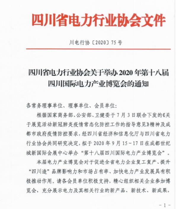 四川省電力行業(yè)協(xié)會關于舉辦2020年第十八屆四川國際電力產(chǎn)業(yè)博覽會的通知