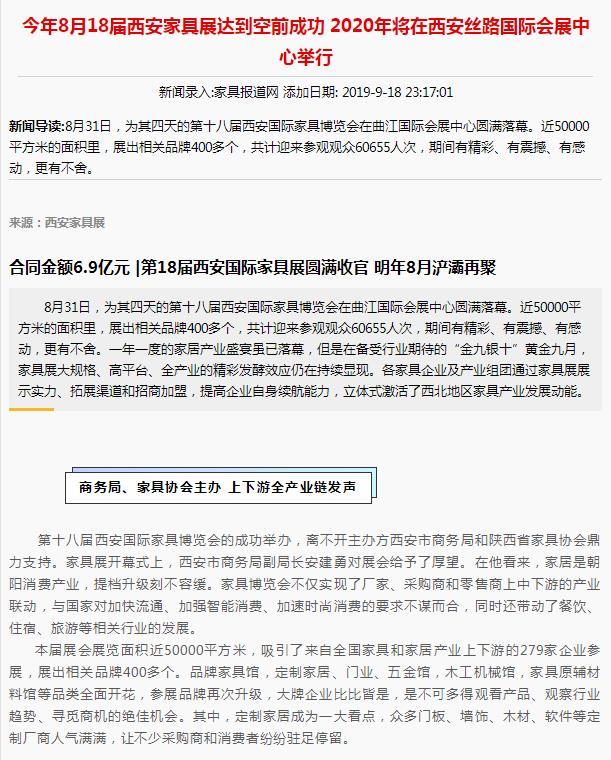 2020年9月17-20日,匯聚眾多期待的第19屆西安國際家具博覽會暨西安全屋定制家居展覽會(以下簡稱西安家具展)將在西安國際會展中心盛大啟幕,呈現(xiàn)一場精彩大氣的家具展,為大型會展活動再添濃墨重彩的一筆。