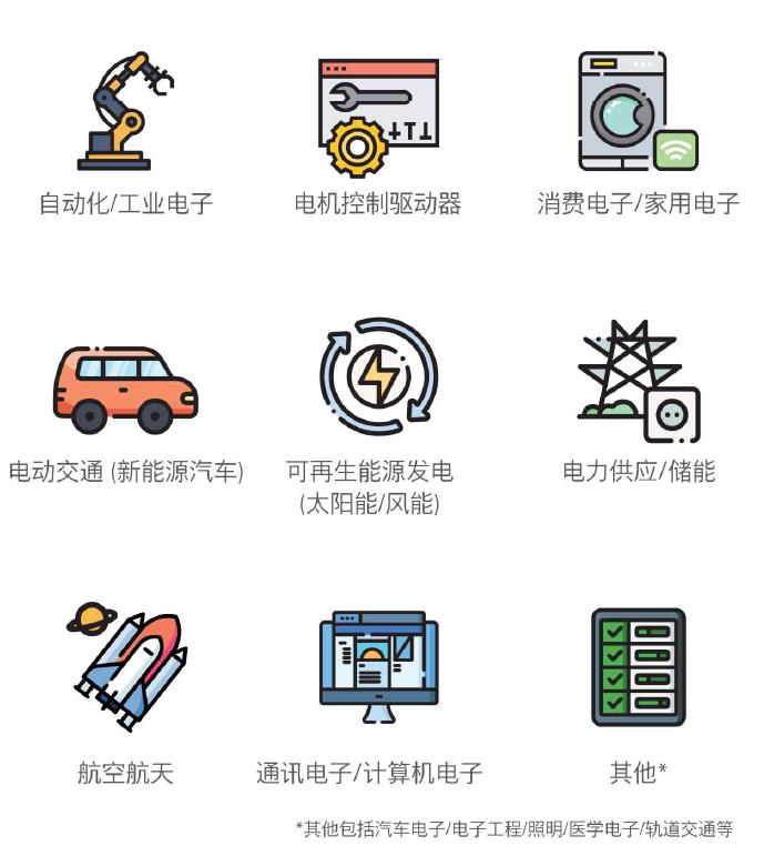 功率半導(dǎo)體元件及模塊、集成電路、無源元件、電磁及磁性材料、散熱管理、傳感器、裝配和子系統(tǒng)、電氣傳動(dòng)、功率轉(zhuǎn)換器、電能質(zhì)量&儲(chǔ)能、測(cè)試&測(cè)量、軟件開發(fā)、信息及服務(wù)