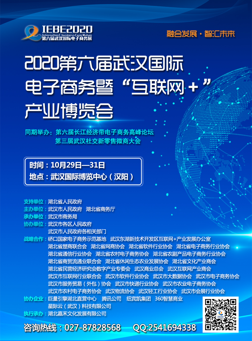 10月29日—31日,由湖北省人民政府支持,武漢市人民政府、湖北省商務廳聯合主辦,武漢市商務局承辦的2020第六屆武漢國際電子商務暨“互聯網+”產業(yè)博覽會(以下簡稱武漢電博會)將在武漢國際博覽中心隆重舉行。