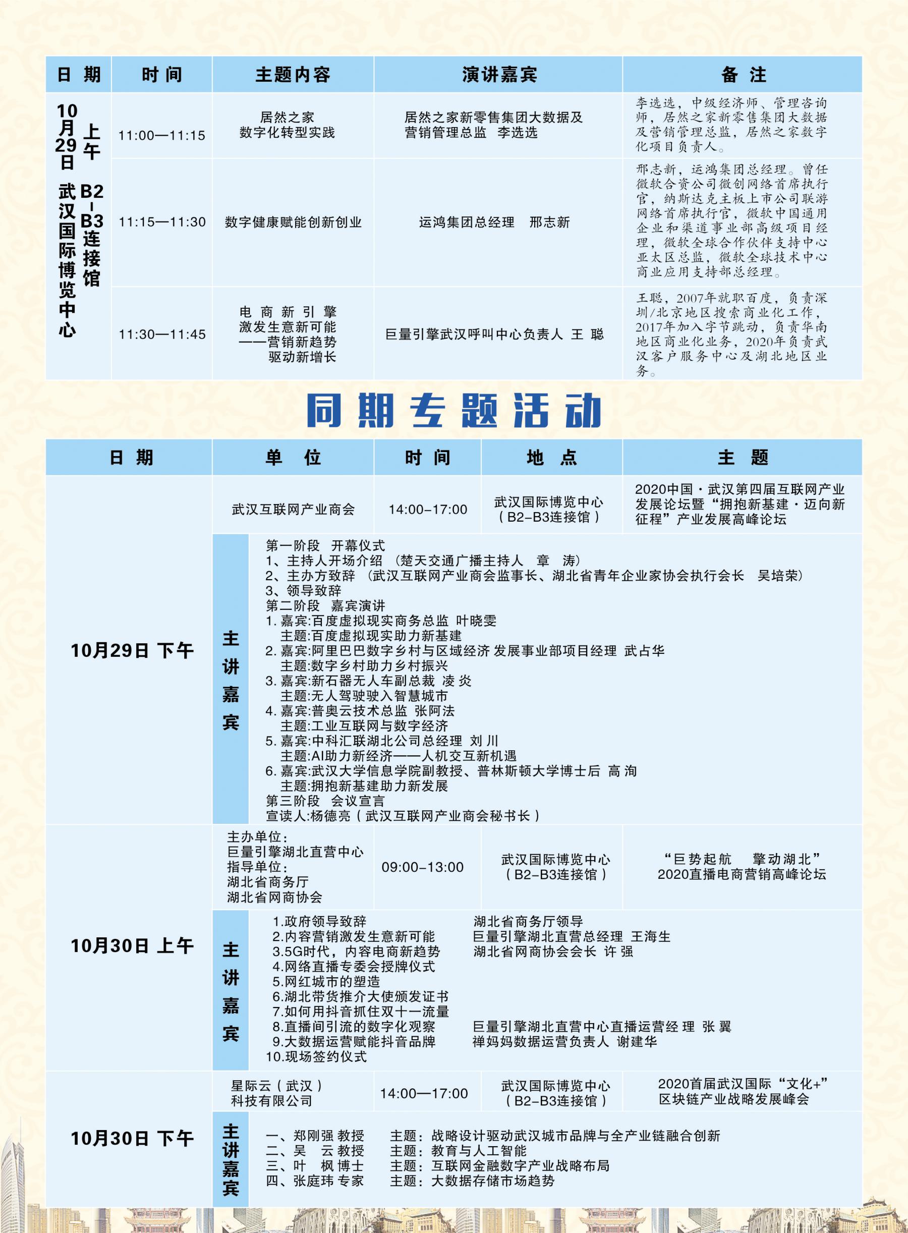 展會將于10月29日開幕,期間將同步舉辦第六屆長江經濟帶電子商務高峰論壇、第三屆武漢社交新零售微商大會、“巨勢起航 擎動湖北”2020直播電商營銷高峰論壇、2020首屆武漢國際“文化+”區(qū)塊鏈產業(yè)戰(zhàn)略發(fā)展峰會、2020中國•武漢第四屆互聯網產業(yè)發(fā)展論壇暨“擁抱新基建 • 邁向新征程”產業(yè)發(fā)展高峰論壇、后疫情時代三農電商發(fā)展峰會——推進雙循環(huán),共育新商機、中國網商網貨大會、采購對接會、重點電商產業(yè)園考察、專題推介會、電子商務人才交流會等。重點邀請相關政府部門領導、國內著名學者和知名電子商務企業(yè)家共同出席大會,并邀請國內外數百家知名媒體進行全方位報道。