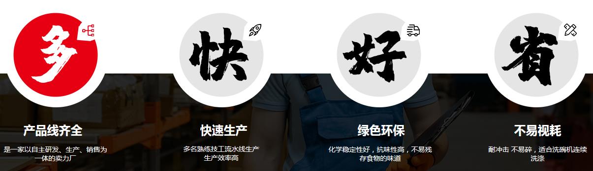 1、作為國內(nèi)密胺餐具的優(yōu)秀生產(chǎn)企業(yè),工廠所有的產(chǎn)品從設(shè)計(jì)、原料、生產(chǎn)工藝、市場(chǎng)銷售-直以“視質(zhì)量為生命,以服務(wù)創(chuàng)市場(chǎng)”為原則。