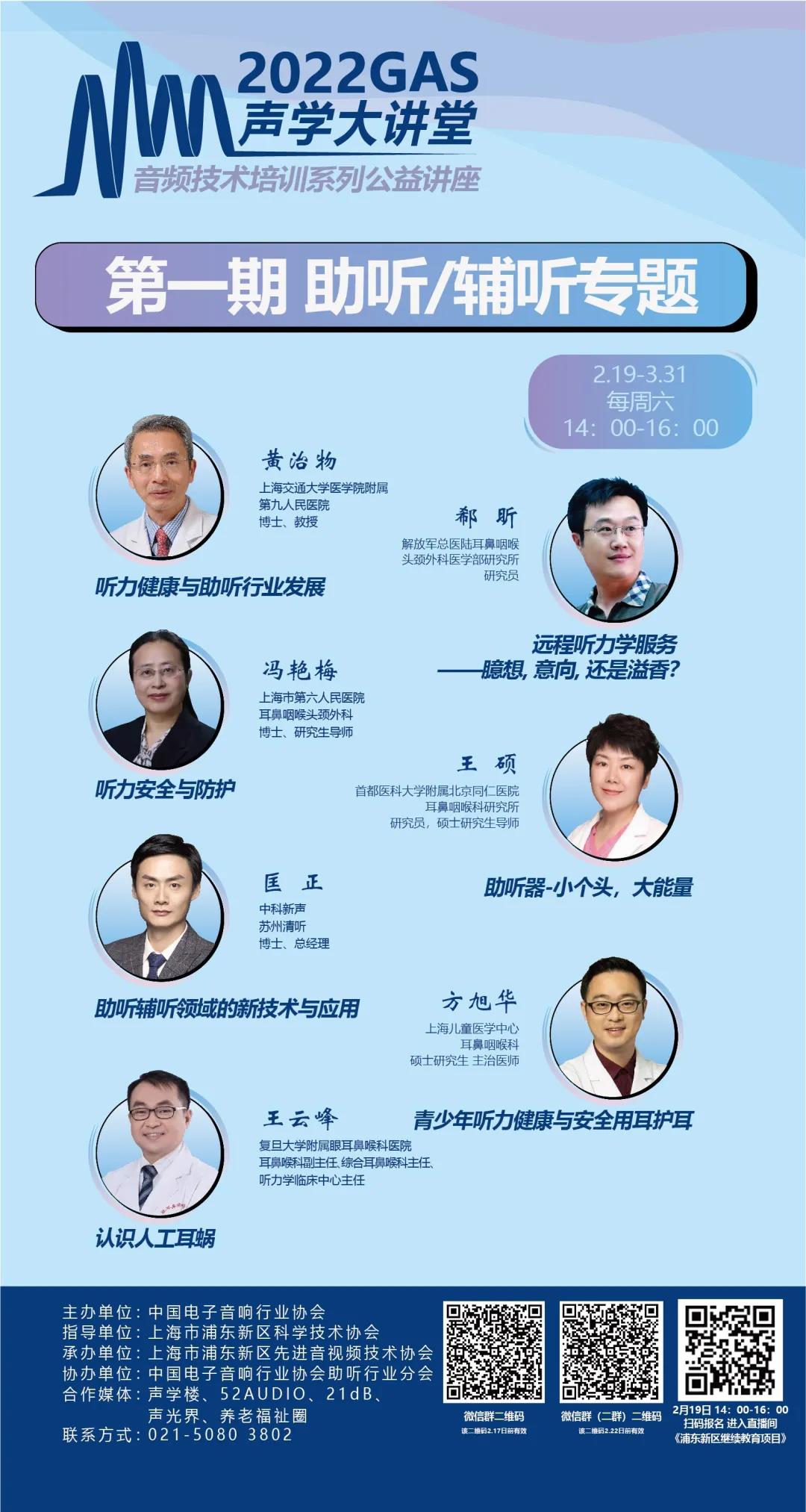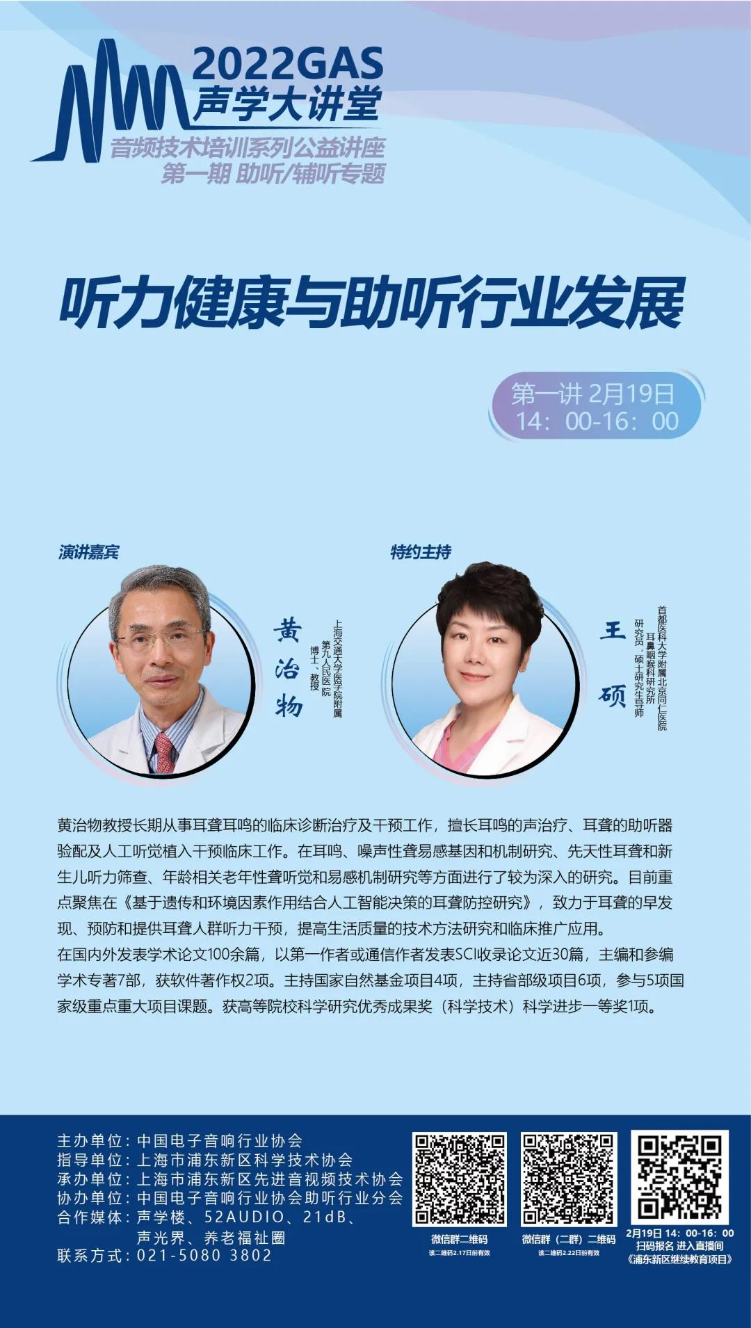 2022年2月19日下午2點(diǎn),協(xié)會(huì)將正式舉辦《2022GAS聲學(xué)大講堂—音頻技術(shù)培訓(xùn)系列公益講座》啟動(dòng)大會(huì),來(lái)自上海交通大學(xué)醫(yī)學(xué)院附屬第九人民醫(yī)院的黃治物教授為大家分享《聽(tīng)力健康與助聽(tīng)行業(yè)發(fā)展》。
