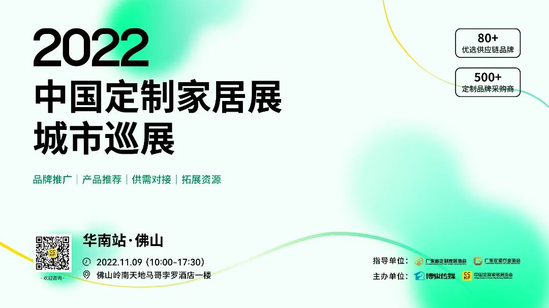 由廣東省定制家居協(xié)會(huì)、廣東衣柜行業(yè)協(xié)會(huì)指導(dǎo),中國(guó)廣州/成都定制家居展、博駿傳媒聯(lián)合全國(guó)各地商協(xié)會(huì)主辦的“2022中國(guó)定制家居展·城市巡展”,將于11月9日首次落地華南站在佛山·嶺南天地馬哥孛羅酒店舉行,本次巡展將以粵港澳大灣區(qū)為中心,輻射廣州、佛山、深圳、東莞、中山等中心城市。