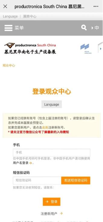 進入預(yù)登記頁面后,往屆觀眾可直接填寫手機號,獲取驗證碼登錄,新用戶請點擊[注冊新用戶]按鈕注冊。