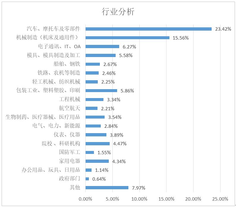 參觀展會的企業(yè)行業(yè),以汽車、摩托車及零部件企業(yè)最多,占到總數(shù)的23.42%,其次為機械制造(機床及通用件),占15.56%。此外,電子通訊、模具、船舶、鋼鐵、鐵路、農(nóng)機、輕工、橡塑包裝、工程機械、國防軍工、航空航天、生物醫(yī)藥、家電等制造行業(yè)均有涉及。