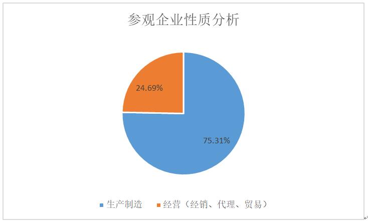 據(jù)展會組委會統(tǒng)計,本次展會參觀企業(yè)達6341家,從企業(yè)性質(zhì)總數(shù)量占比來看,生產(chǎn)制造企業(yè)占75.31%,經(jīng)營(經(jīng)銷、代理、貿(mào)易)企業(yè)占24.69%,兩者合計占100%。由此可以看出,在參觀企業(yè)中,以生產(chǎn)制造企業(yè)為主,占比較大。