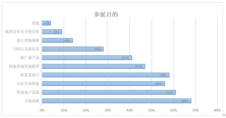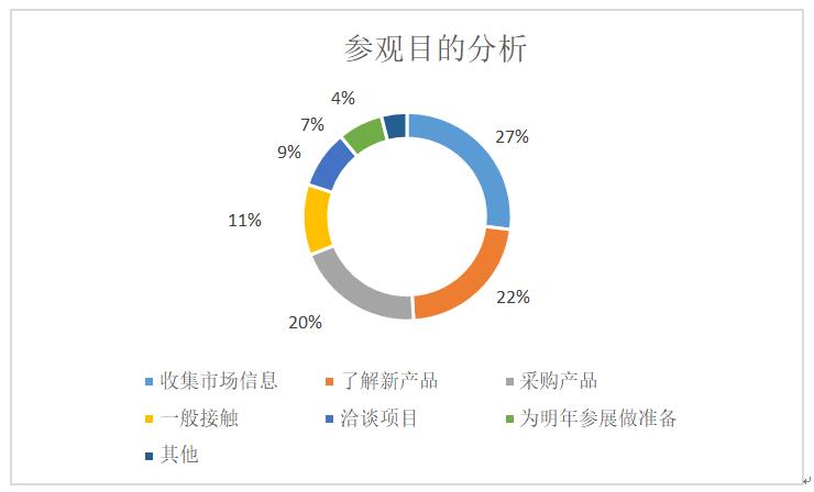 專業(yè)觀眾的參觀目的有“收集市場信息”“了解新產(chǎn)品”“采購產(chǎn)品” “一般接觸”“洽談項目”“為明年參展做準(zhǔn)備”,比重依次降低。