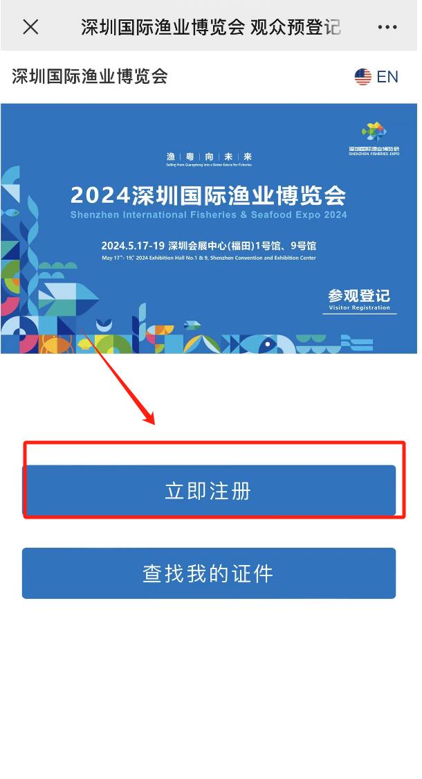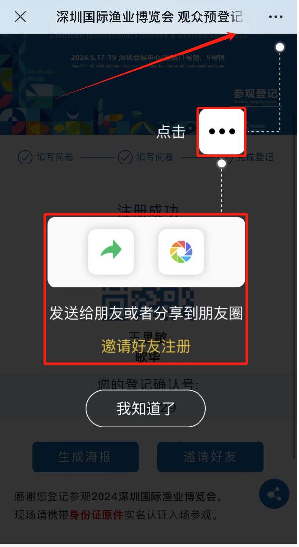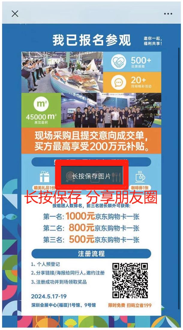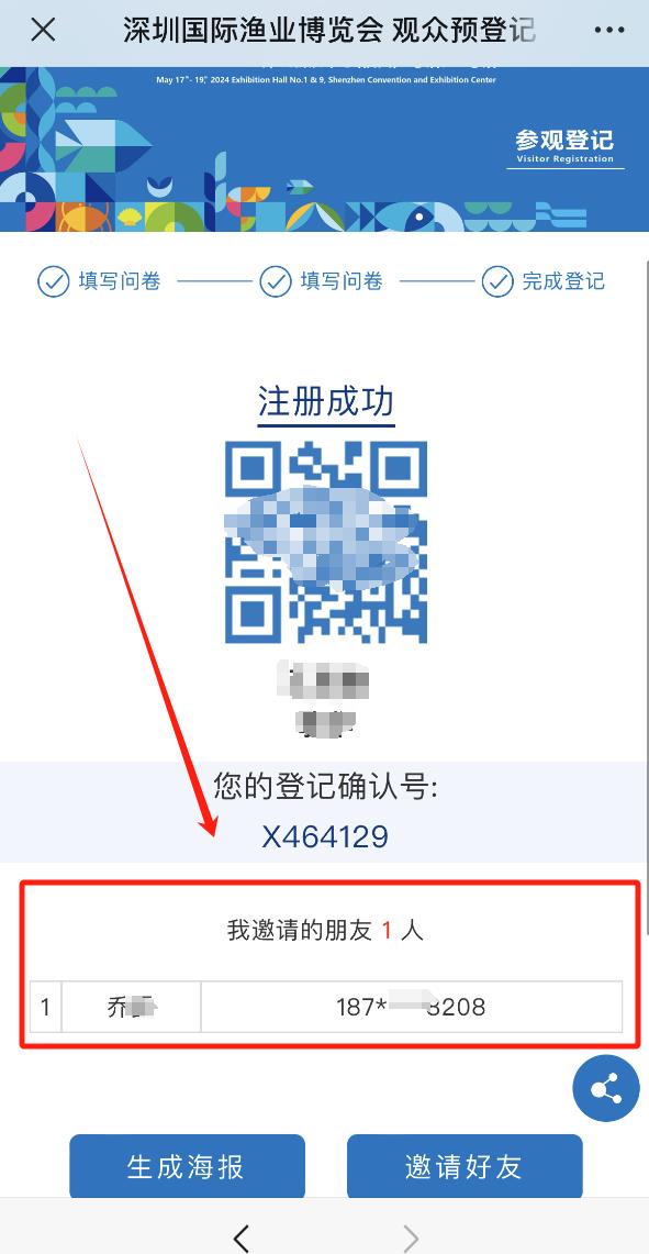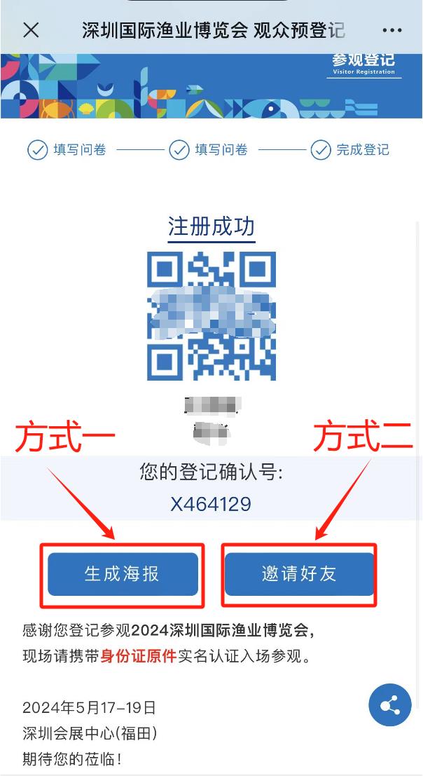 點擊“深圳漁業(yè)博覽會公眾號-免費領票”菜單欄,完成個人注冊后選擇【生成海報】,長按保存分享;或者選擇【邀請好友】,分享鏈接給同事/好友/朋友圈。